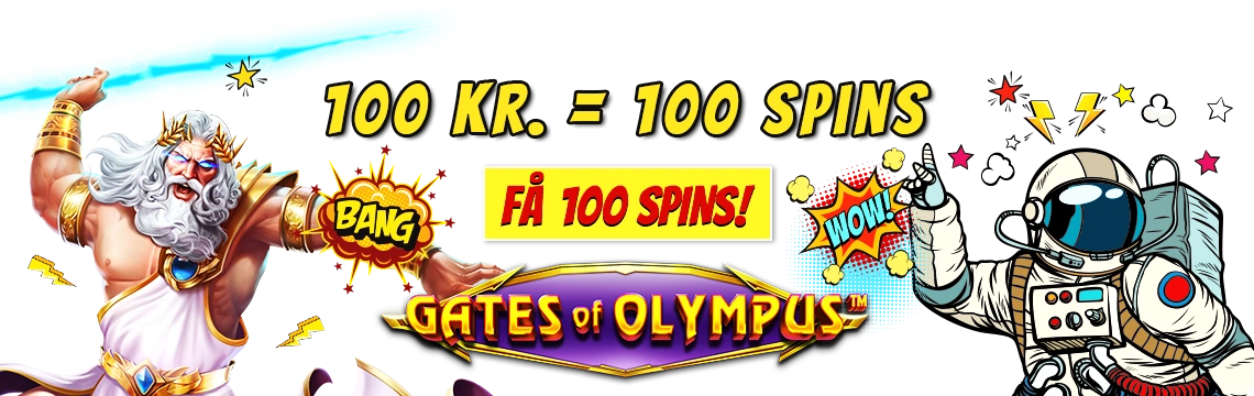1. Velkomstbonussen er 100 Spins til Gates of Olympus, betinget af en overførsel på minimum 100 kr. Hvert Spin har en værdi på 1 kr.